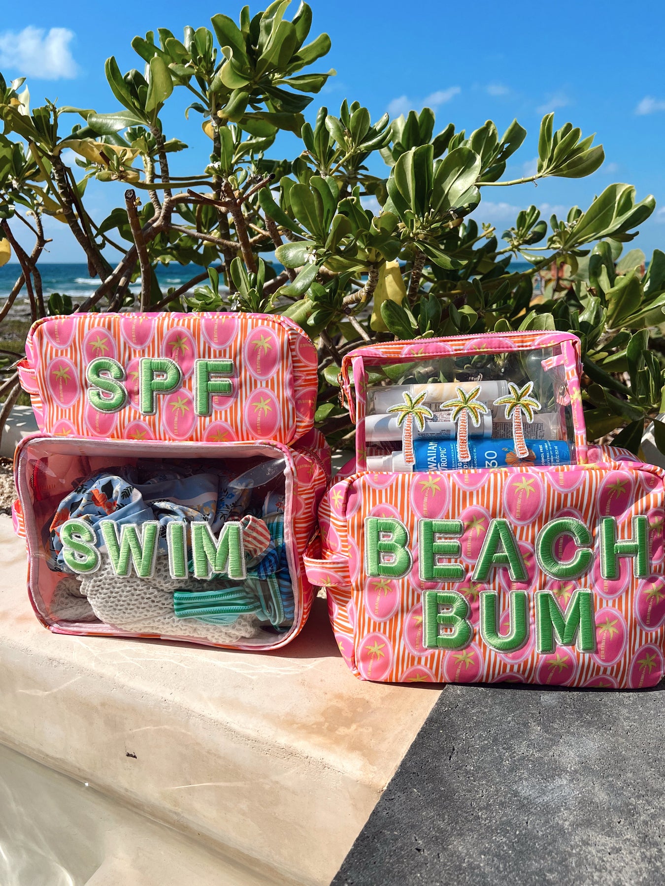 • This pink palm tree snap clear pouch is perfect for days in the sun + on the beach!