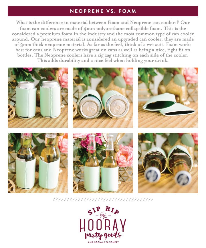 Sip Hip Hooray Custom Neoprene Slim Can Coolers are the perfect addition to any wedding, birthday, bachelorette party, vacation, reunion, retirement or to sip at home in style! Our slim can coolers fit perfectly on any skinny can! Keep the condensation off your hand and your drinks cold with your own Custom Slim Neoprene Can Coolers by Sip Hip Hooray!