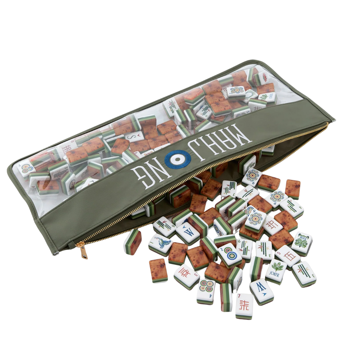 Rugged yet refined, the Forest Green Mahjong Zippered Bag is built for those who appreciate classic craftsmanship. The deep forest green canvas, accented with sturdy white and brown embroidery, evokes the richness of the great outdoors. Designed for both durability and function, it features a spacious interior, a secure zipper closure, and a clear bottom section for quick access to your tiles. Whether at home or on the go, this bag is the perfect companion for a game well played.