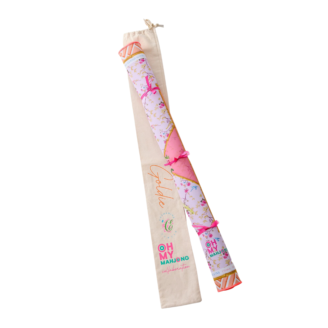 Meet the Goldie Mahjong Mat, created with Catherine Cartie to complement our Sunset Tiles. This mat captures the warm, golden hues of a perfect sunset, paired with radiant pink and coral tones to evoke the beauty of evening light. A bold neon orange border adds an extra pop of playful energy. Goldie’s neoprene construction makes it easy to clean, and its rubber non-slip backing keeps it firmly in place. Instructional reminders along the edges make gameplay elegant and effortless, while its bold design adds a touch of warmth to any game night.