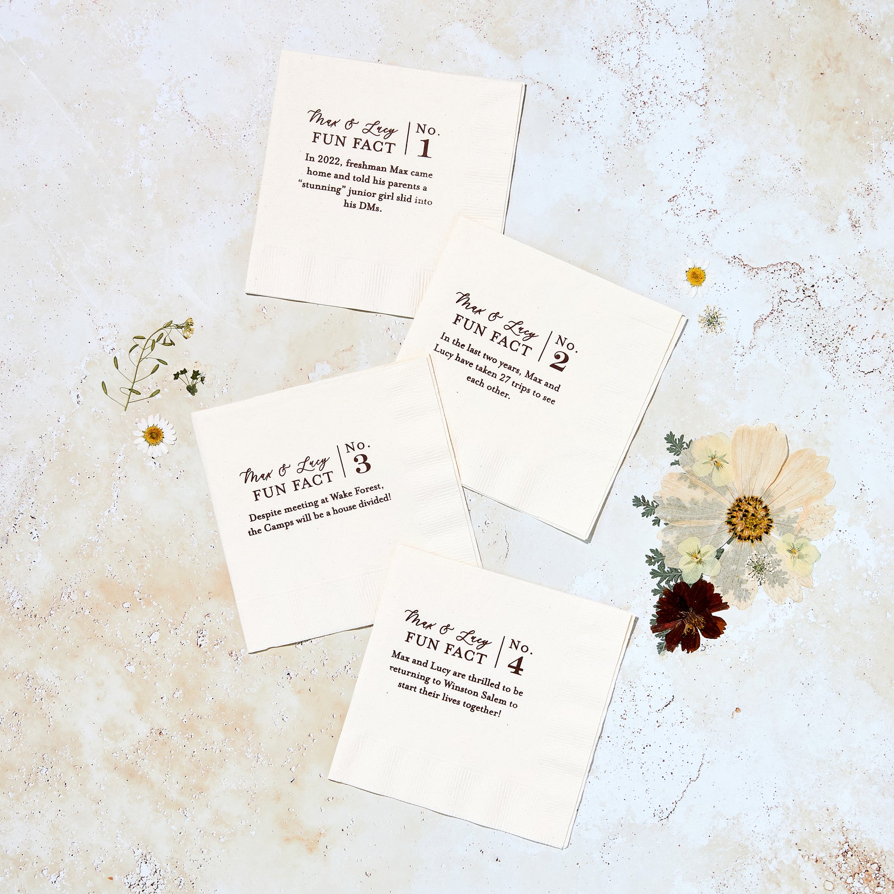 Our fun fact napkins are the perfect way to share your special qualities and moments with your guests! Customize up to 10 sets of fun facts using one fact per napkin!