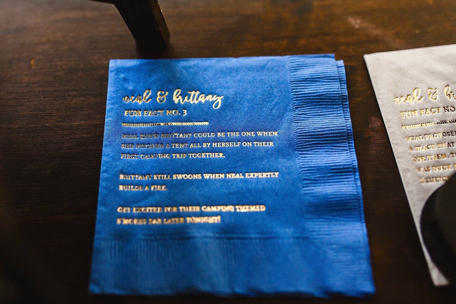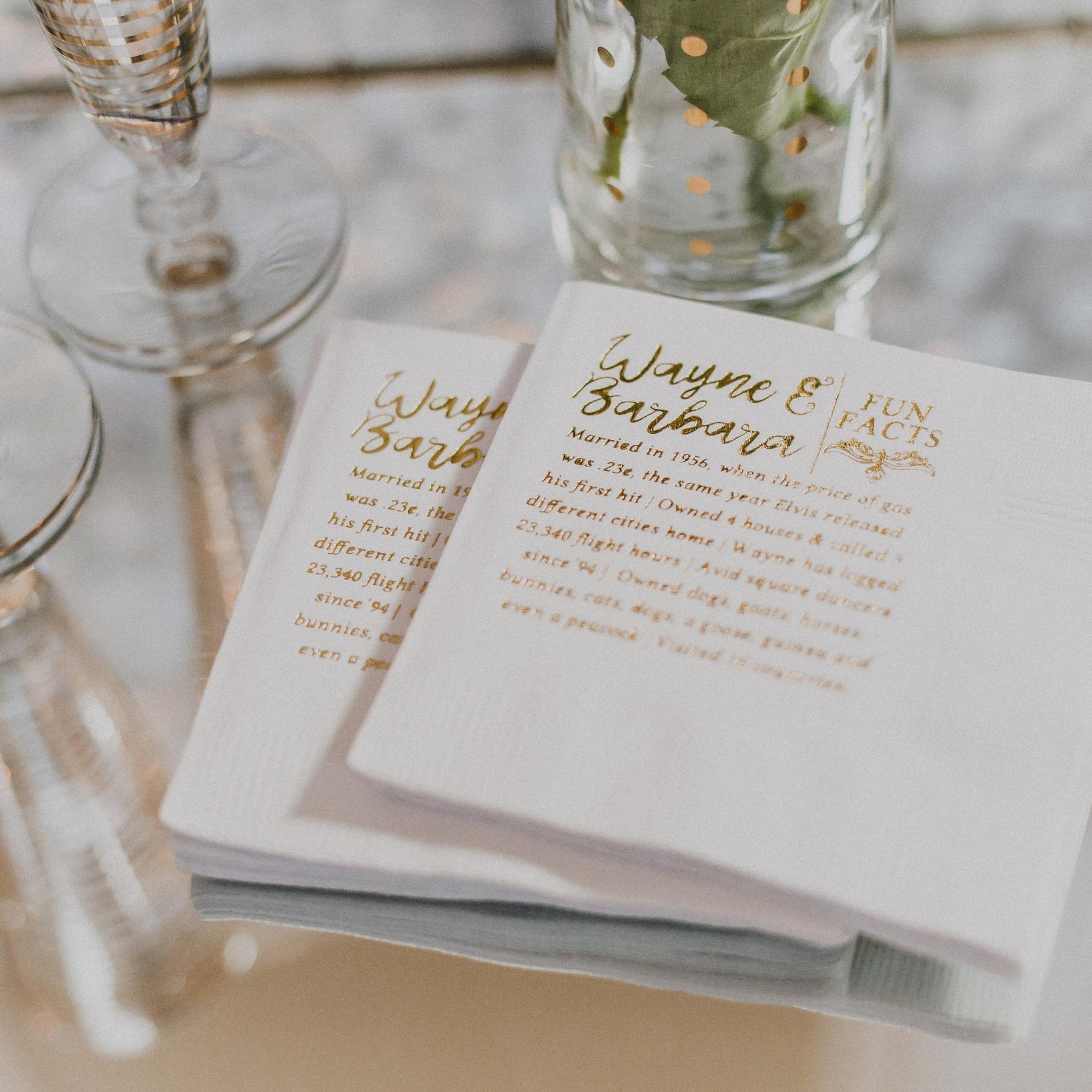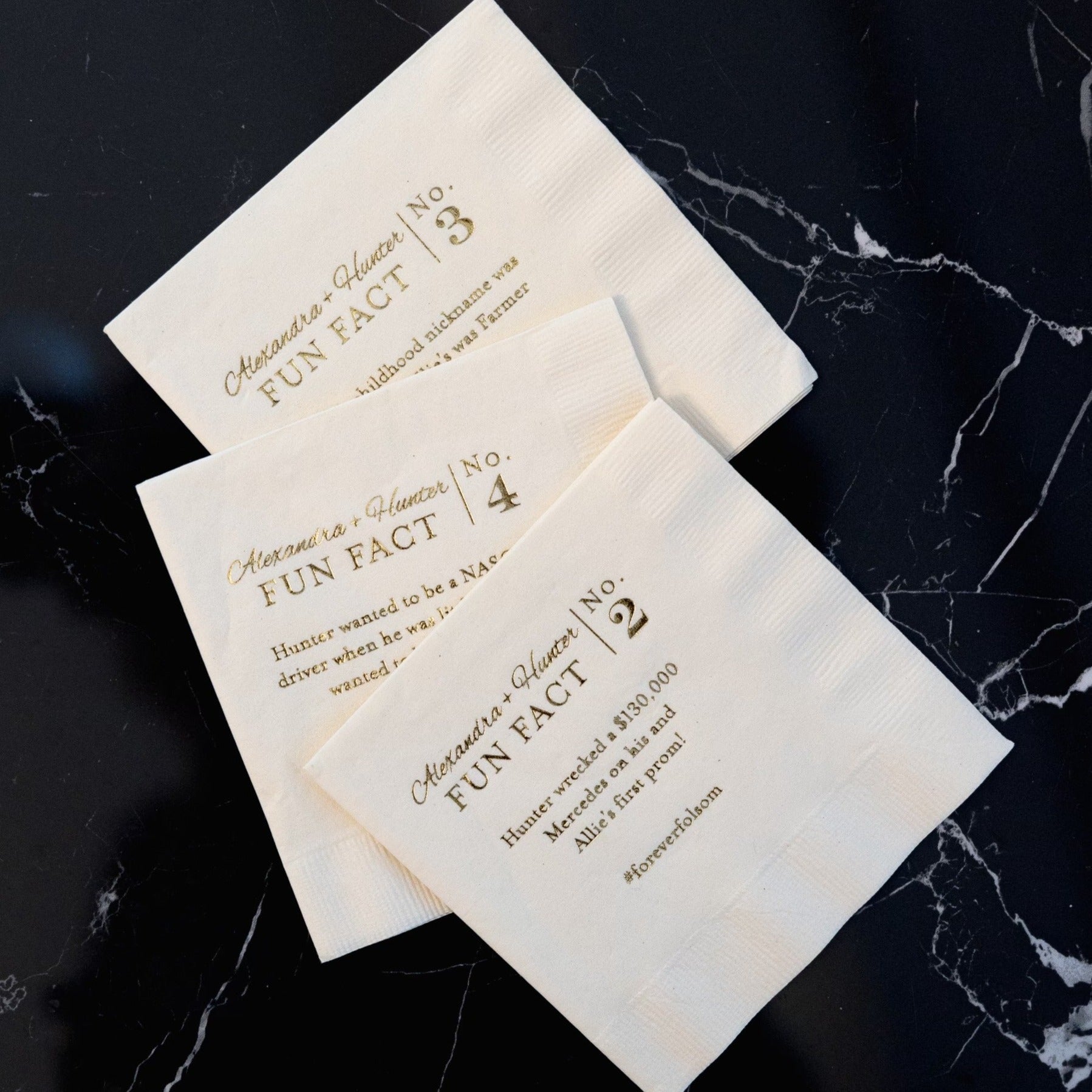 Our fun fact napkins are the perfect way to share your special qualities and moments with your guests! Customize up to 10 sets of fun facts using one fact per napkin!